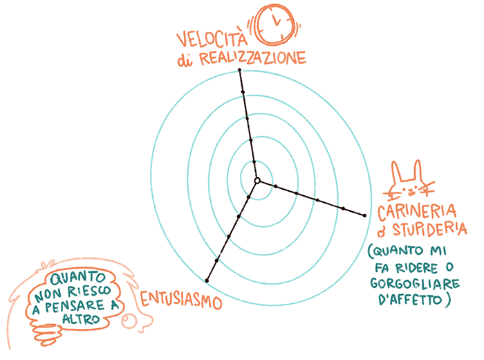 Il principio è semplice: più punti ha un progetto più è probabile che mi ci dedicherò. Ho collocato la soglia che mi fa passare all’azione nel punteggio 7, ma il tempo potrà smentirmi. Vi faccio qualche esempio sul suo utilizzo: