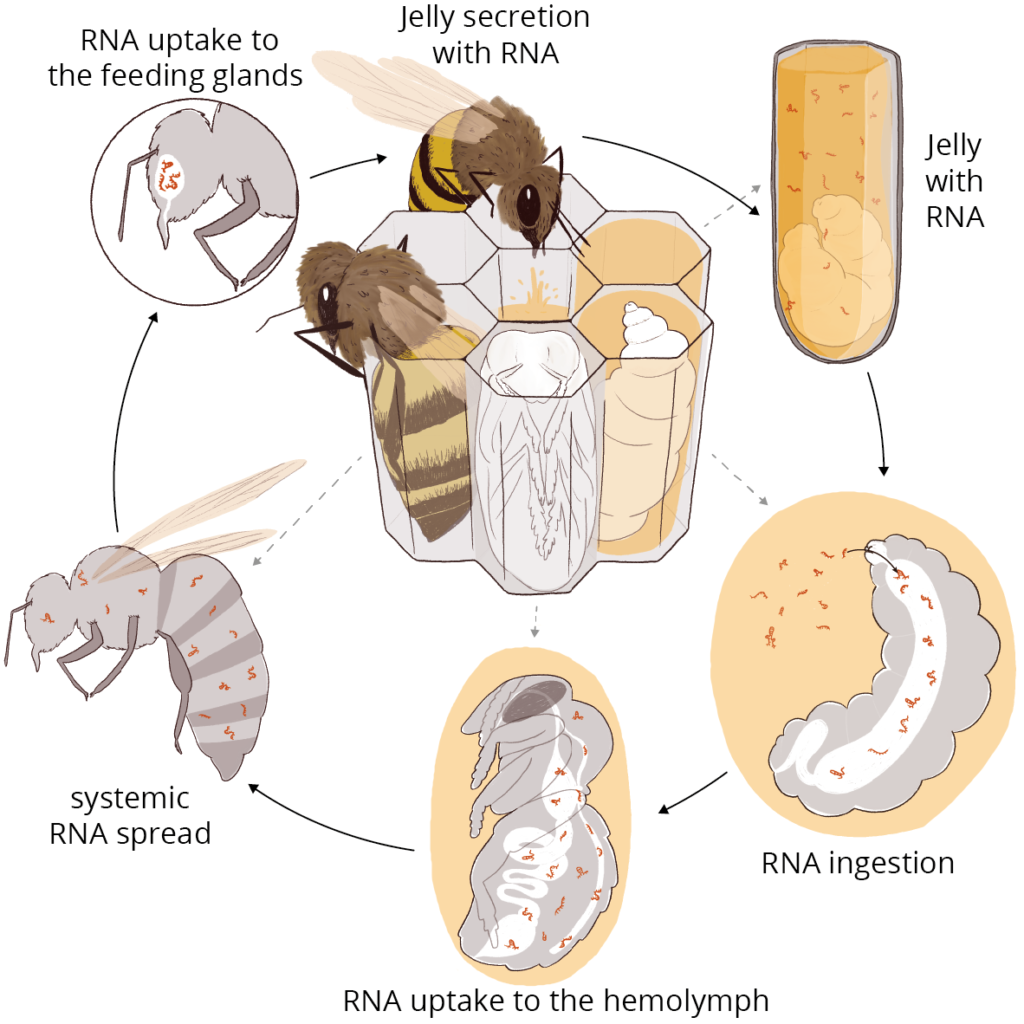 Eyal aveva scoperto che tramite i gel nutritivi (come la pappa reale) le api condividono con le loro larve dei piccoli frammenti di RNA, provenienti sia dal loro stesso genoma, sia da agenti esterni. Questi RNA vengono ingeriti dalle larve e agiscono da messaggeri, portandole a compiere dei cambiamenti di espressione genetica o altro. Fra le altre cose, grazie a questi RNA le api si possono passare l’immunità da alcune malattie (e in questo caso nella pratica funzionano un po’ come dei vaccini). Qui uno schema che ho fatto per questo paper (che potete leggere qui):