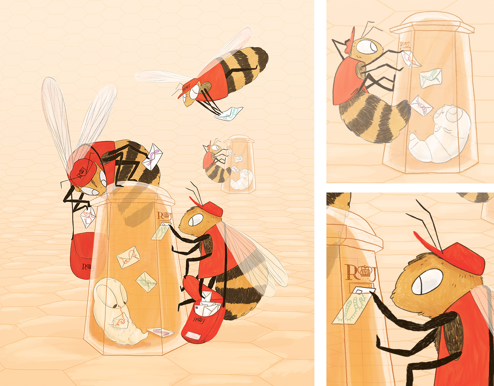 L’idea è stata quella di associare il Royal Jelly (pappa reale) con la Royal Mail inglese: le api sono diventate quindi postine di lettere di RNA che consegnano alle loro larvette, in cellette molto simili alle colonnine delle poste inglesi. Avevo fatto queste due bozze iniziali: