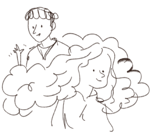 i disegni sullo sfondo di Mirzakhani sono tratti dalle sue ricerche. Volevo fare una cosa del genere anche con Colombo ma è intervenuto un problema: aiutata da amici matematici ho scoperto che lei studia cose associate alle nuvole (ora non andiamo nel dettaglio che non ne so molto di più) e i suoi lunghi capelli mossi mi sembravano ottimi per poter fare una crasi visiva di nuvola e capelli. Il problema nella composizione precedente era che le nuvole sarebbero state sovrapposte al volto di Mirzakhani, rischiando di farle fare capolino dai cieli stile Mufasa del Re Leone. Tipo così: