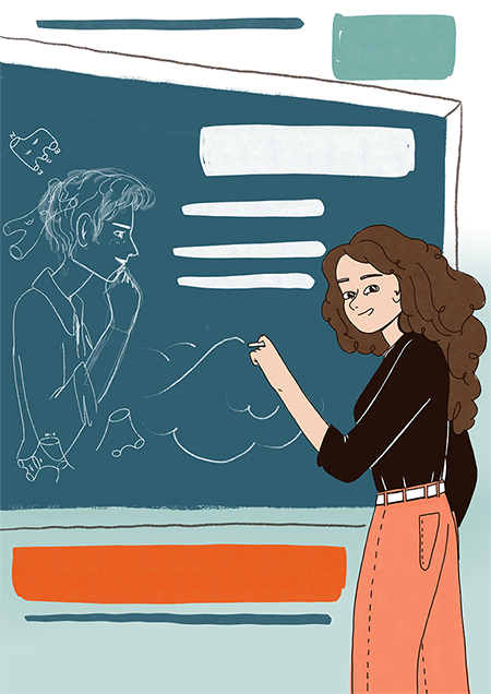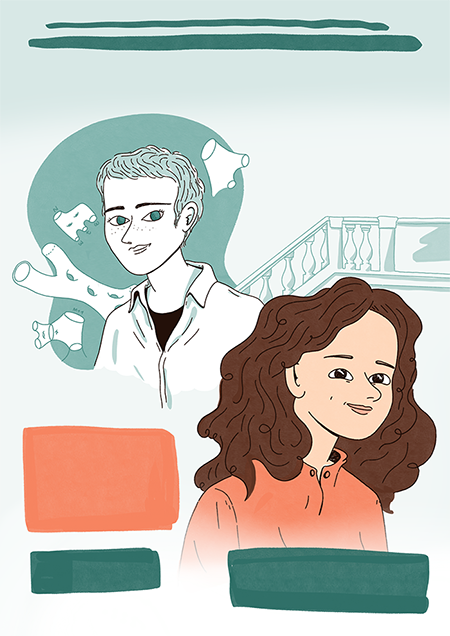 Le uniche cose che mi hanno chiesto da Tor Vergata son state di mettere i ritratti di entrambe le scienziate, e che forse sarebbe stato carino fare un accenno alla Scuola Normale, a mia discrezione. Per cui ho iniziato googlandole e prendendo la mano con i loro volti. Questa è stata la mia prima bozza, molto semplice: