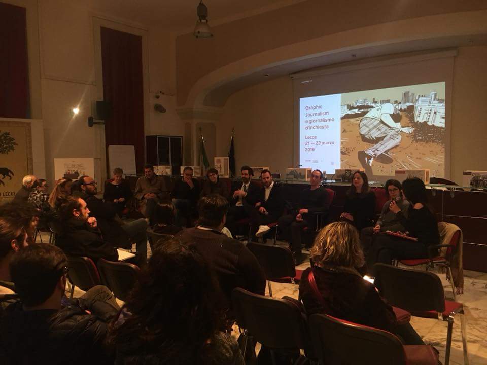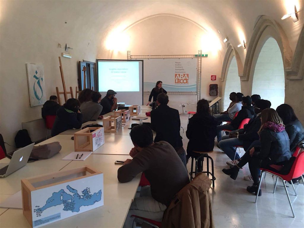 Un modus operandi che in effetti si applica anche al lavoro dei ragazzi di Graphic News, su cui ci siamo concentrati il giorno dopo, in un workshop all’Accademia delle belle arti. C’erano un bel po’ di persone, tra cui alcuni ragazzi dello Sprar di Campi e di Surbo, una bella sorpresa che non ci aspettavamo.