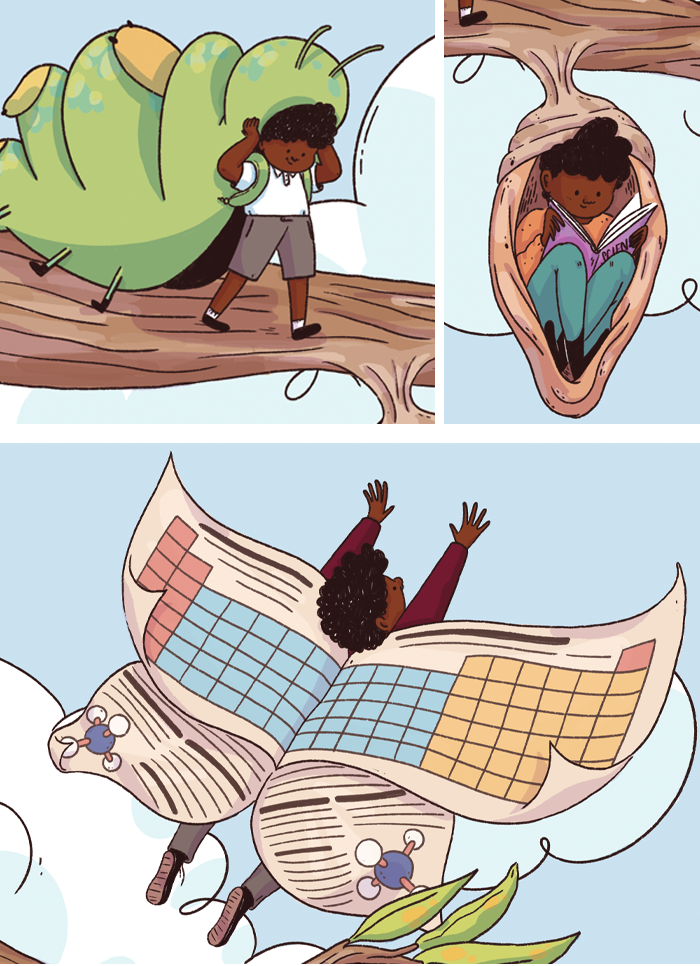 Di solito il processo delle illustrazioni editoriali inizia con il ricevere l’articolo e farsi venire delle idee. In questo caso invece quando mi hanno contattata l’articolo ancora non era stato finito, quindi mi hanno dato loro il tema: il graduale sviluppo dello studente negli anni, raccontato tramite gli stadi di metamorfosi delle farfalle.