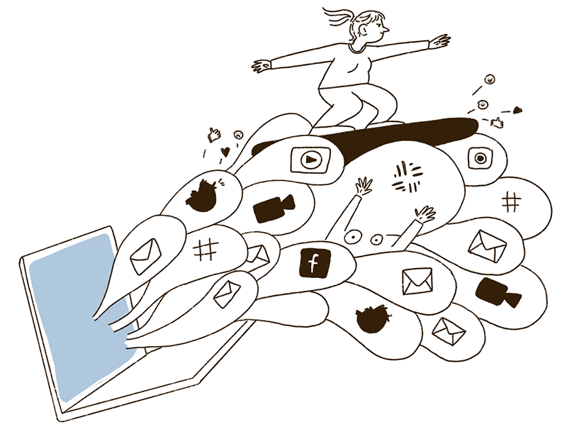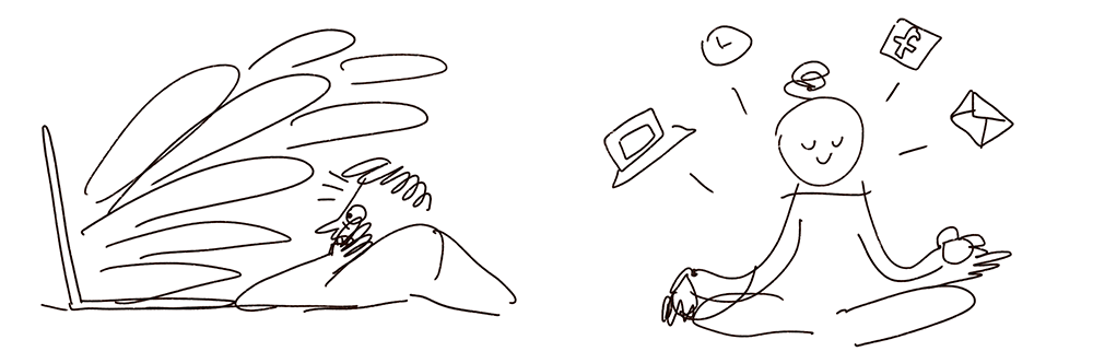 Io volevo dare l’idea dell’essere sommersi dalle troppe notifiche e della necessità di trovare un equilibrio in questa nuova condizione. Ecco due doodlini fatti mentre riflettevo per trovare l’idea giusta: