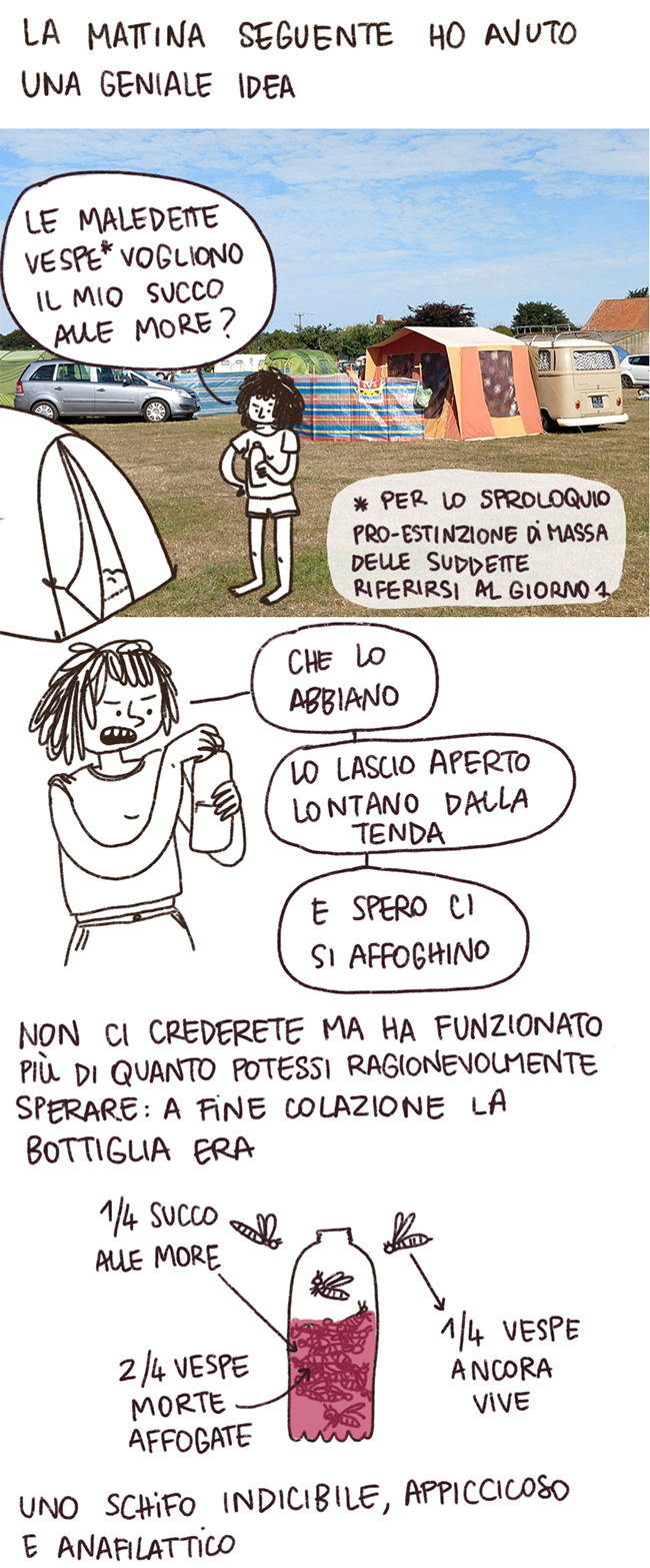 Per chi ha riflessi ecologisti troppo forti: abbiamo buttato la bottiglia di plastica, dopo averla svuotata delle vespe, nel cassonetto giusto. Non sto a dire che non l’ho fatto io, che al massimo avrei usato un lanciafiamme, ma è merito dei miei valorosi compagni di viaggio.