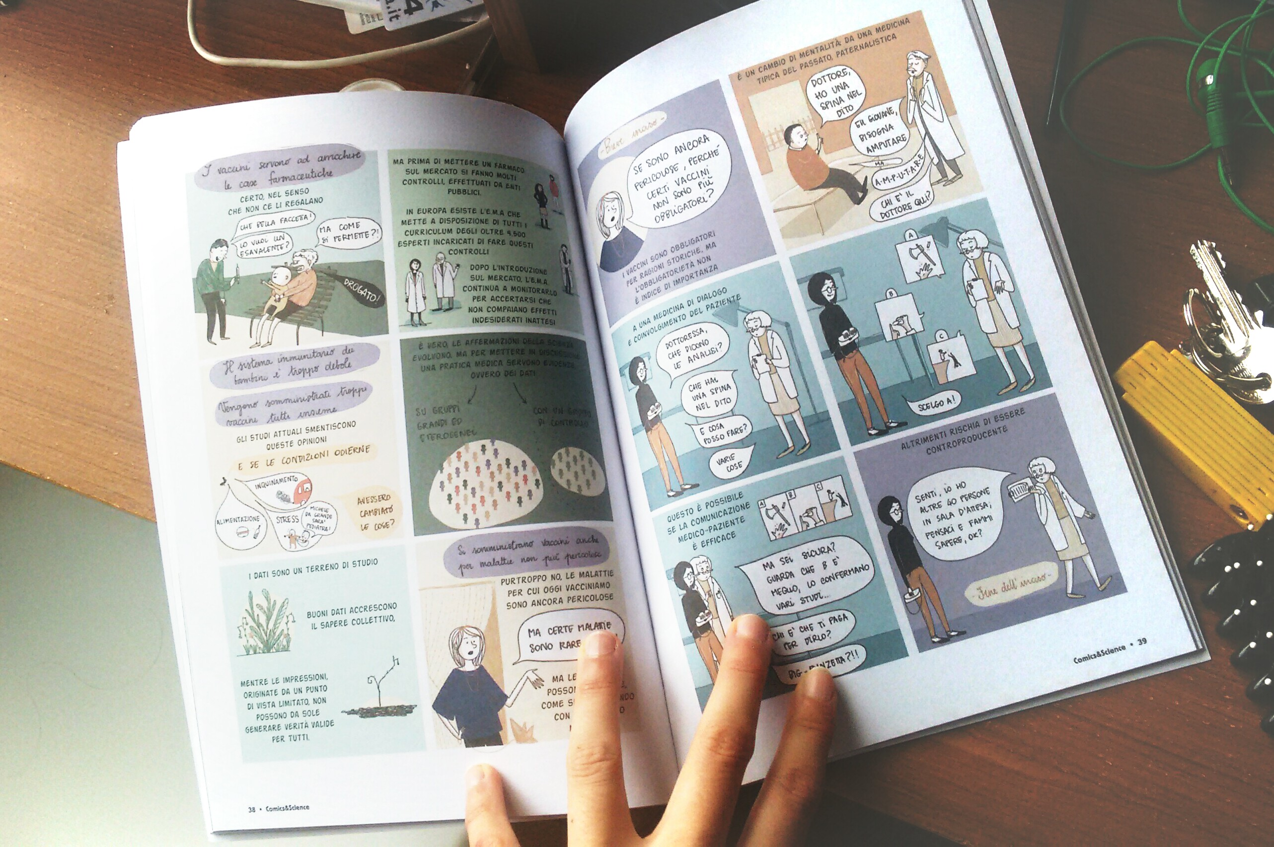 Alle 12 ero a quello del CNR che promuoveva il nuovo numero di Comics&Science. Dentro, rilegato con un fumetto di Silver, si trovava il mio articolo sui vaccini, già pubblicato da Graphic News (è un link, non l’ho scritto in bold perché sono pazza). Lo avevo colorato un po’ di più perché ho scoperto che su carta la mia pigrizia non paga e poi sembra che non abbia avuto voglia di disegnare gli sfondi. Che malfidati.